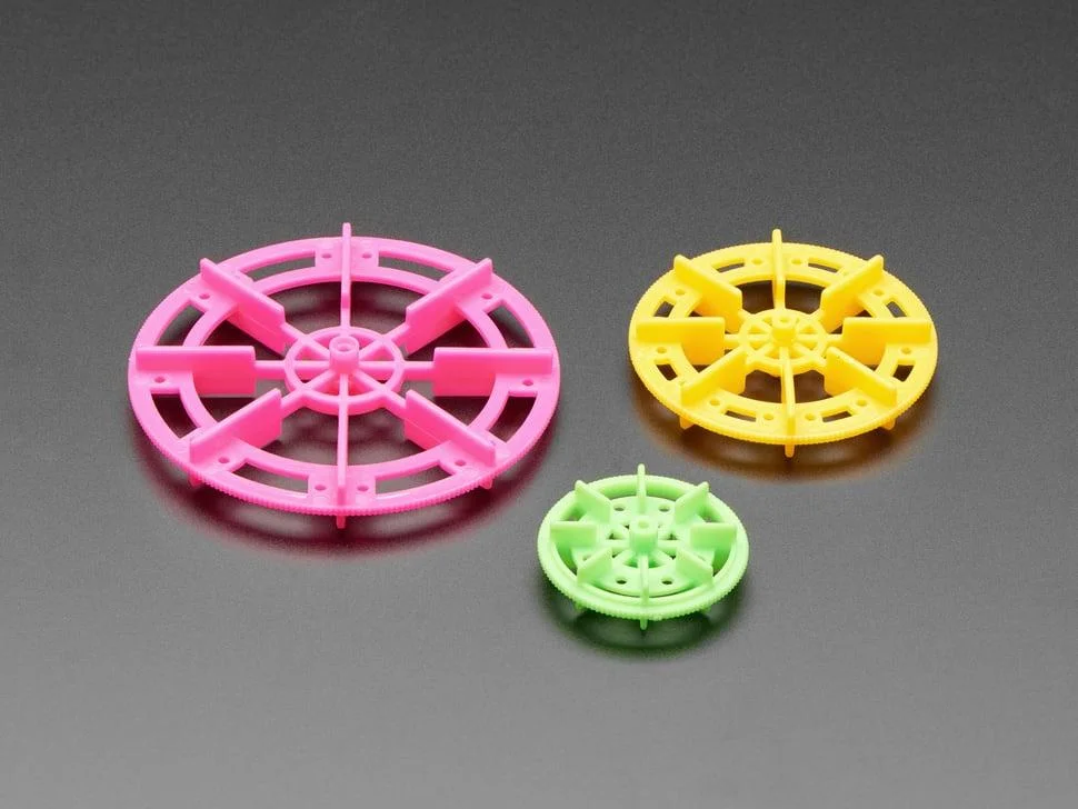 Sebbene assomiglino alle pale di una ruota idraulica, queste ruote eccellono nel fornire molteplici punti di aggancio semplici. Utilizzate colla a caldo, nastro adesivo resistente o fascette per fissare facilmente i vari componenti. Si prega di notare che il loro design sottile le rende inadatte alle ruote dei rover robotici.