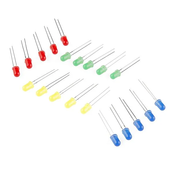 Sparkfun offre una gamma di LED colorati in una comoda confezione da 20. Questo set include LED di base rossi, gialli, blu e verdi da 5 mm. Ogni colore viene fornito con cinque pezzi, tutti ben confezionati in una borsa riutilizzabile di sicurezza ESD.