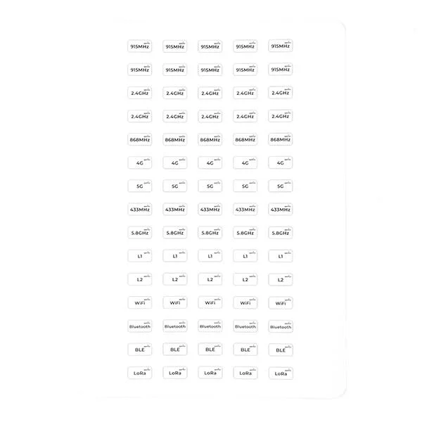 Il foglio di adesivi include 10 adesivi ciascuno per le frequenze 915 MHz e 2,4 GHz e 5 adesivi ciascuno per le frequenze 868 MHz, 4G, 5G, 433 MHz, 5,8 GHz, L1, L2, WiFi, Bluetooth, BLE e LoRa. Questa gamma completa ti garantisce di avere tutte le etichette di frequenza necessarie per la tua collezione di antenne.
