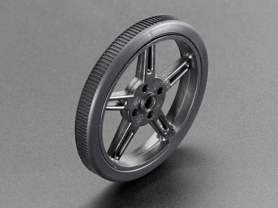 Questa ruota per servocomando a rotazione continua in plastica nera \\u00E8 dotata di un resistente pneumatico in silicone e di un semplice design a pressione per un fissaggio perfetto al tuo micro servocomando FS90R. Perfette per la creazione di robot piccoli e agili, queste ruote garantiscono movimenti rapidi e affidabili.